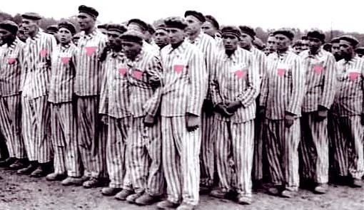 A group of men wearing berets and striped uniforms emblazoned with a pink triangle.