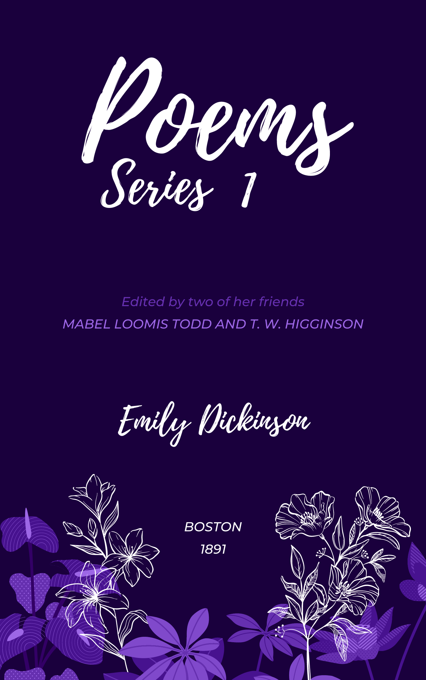 A purple book cover with white text that reads Poems, Series 1 by Emily Dickinson. Edited by two of her friends, Mabel Loomis Todd and T. W. Higginson. Boston 1891. There are white and purple flowers on the bottom of the cover.